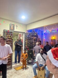 (Dec 15-18th: Christmas Caroling at a spiritually divided home. Notice the cross right beside a picture of an idol. This is not uncommon due to the mixed religious atmosphere.)