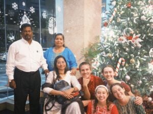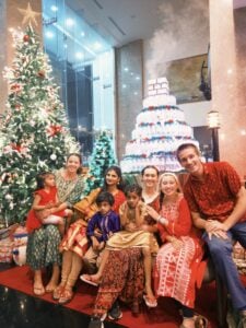 (Dec 21st: Another photo! Now with one of the church families, minus the husband whose name is Moses. Moses drives us in the vans and also serves us noodles with his noodle stand occasionally! Shakina is the little one in red, then Skylar, Moses’ wife, Justin the boy in blue, Abishege the energetic little lady on my lap, Me, Rissa and Carter!)